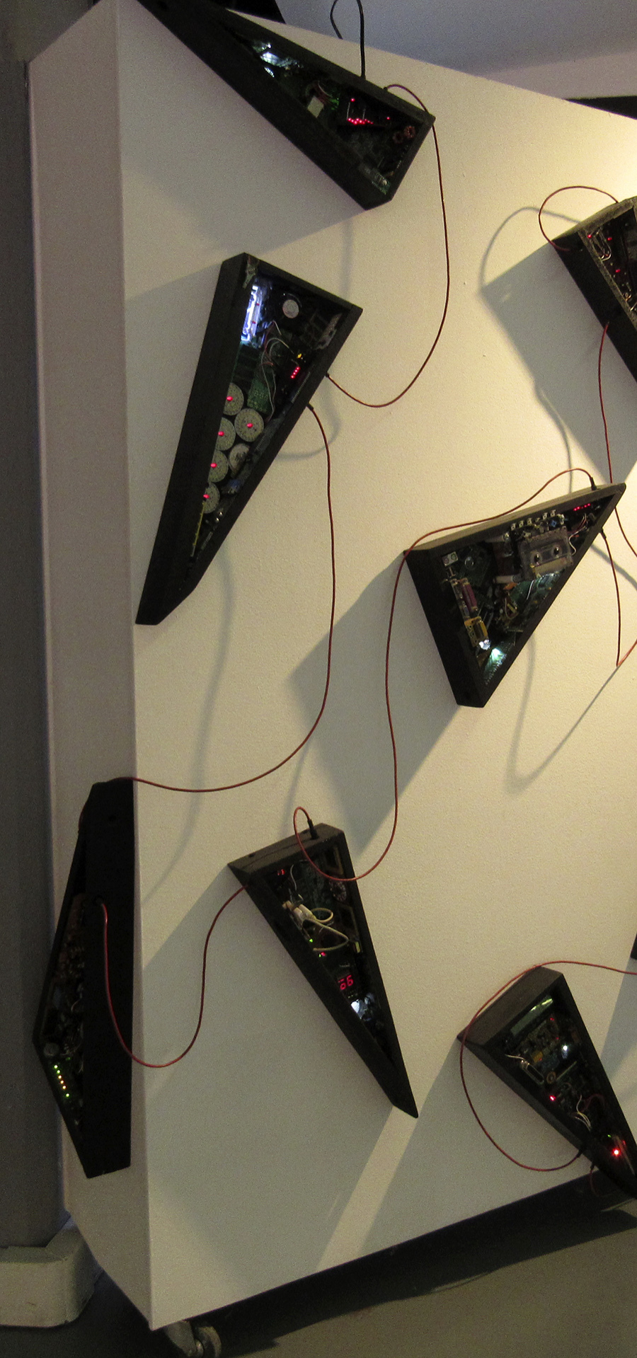 Esta obra instalativa, se compone de 18 piezas escultóricas individuales, donde cada una tiene forma geométrica triangular. Cada pieza de este nuevo sistema que presento aquí, tiene también comportamiento autónomo en cada unidad, pero a diferencia de su antecesor "COLONIA", los comportamientos son ampliamente variados: hay numerosa iluminación leds, hay movimiento de dispositivos motorizados, hay sonidos, mecanismos varios y hay también numerosas partes y piezas de componentes electrónicos y eléctricos diversos. En definitiva, toda una 'sociedad' en actividad dentro de cada uno de estas esculturas triangulares.